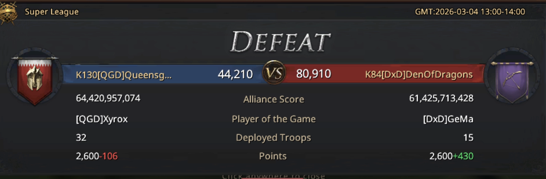 And with this comes the end of today’s Siege of Winterfell’s match (without Winterfell lol, had to say something about this). It’s a win for DxD who was able to score over 80 thousand points, getting the full rewards while QGD was able to get 44 thousand points. If we consider the number advantage it’s a disaster for QGD but we also have to consider the difference in strength and the new rules coming into effect with today’s game. QGD took some time to get used to it which allowed DxD to enjoy lots of points from the first dragons but eventually QGD caught up and were able to get their first ever dragon to their base. As for buildings, the focus was never mainly on them but regardless it was a pretty even fight with fluctuations here and there but it was mostly a 50/50. Great win for DxD who showed impeccable teamwork