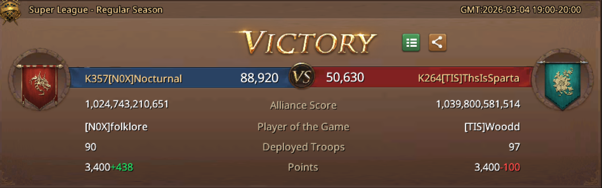 Amazing first round for [N0X] that despite being outnumbered they fought valiantly and managed to overcome that disadvantage and score the first win of the season. They took the rewards and head back to the castle with big hopes they can repeat the performance on the upcoming rounds and hopefully qualify for SoW UC. But as the round progresses the more you win the harder opponents you'll get, will [N0X] be able to withstand the upcoming threats? We'll have to wait and see. See you all on the battlefield!