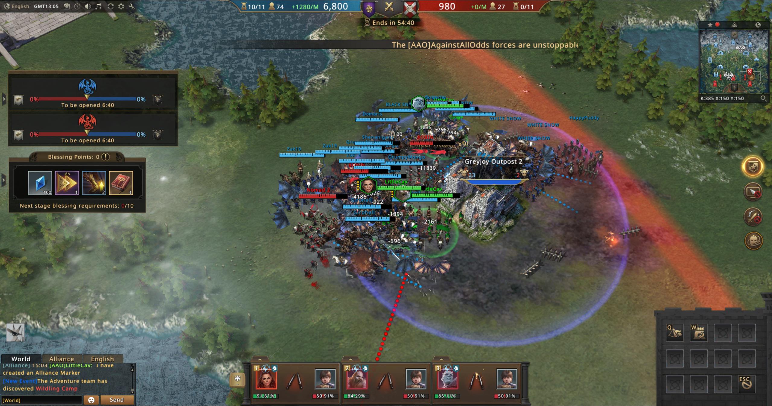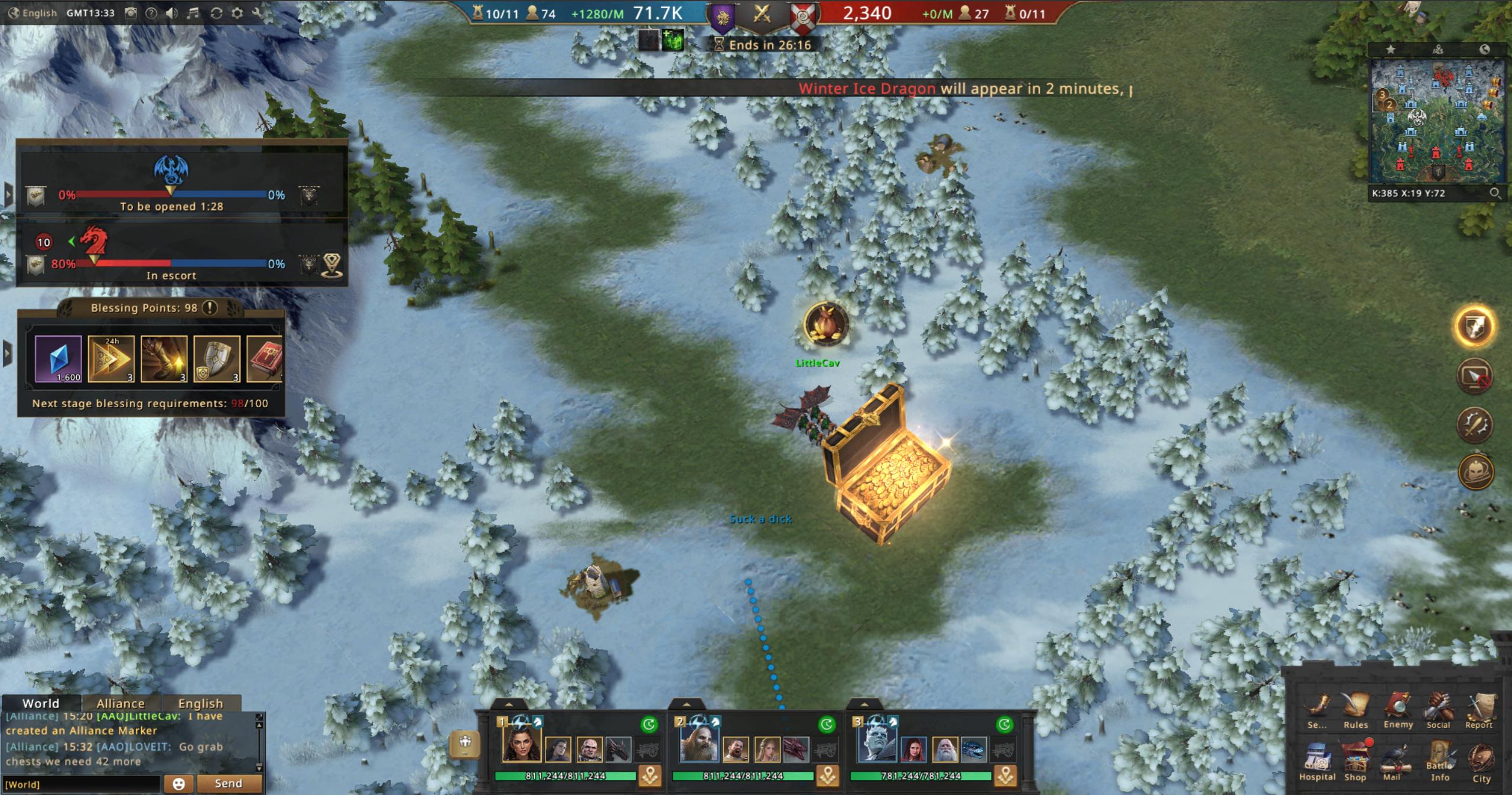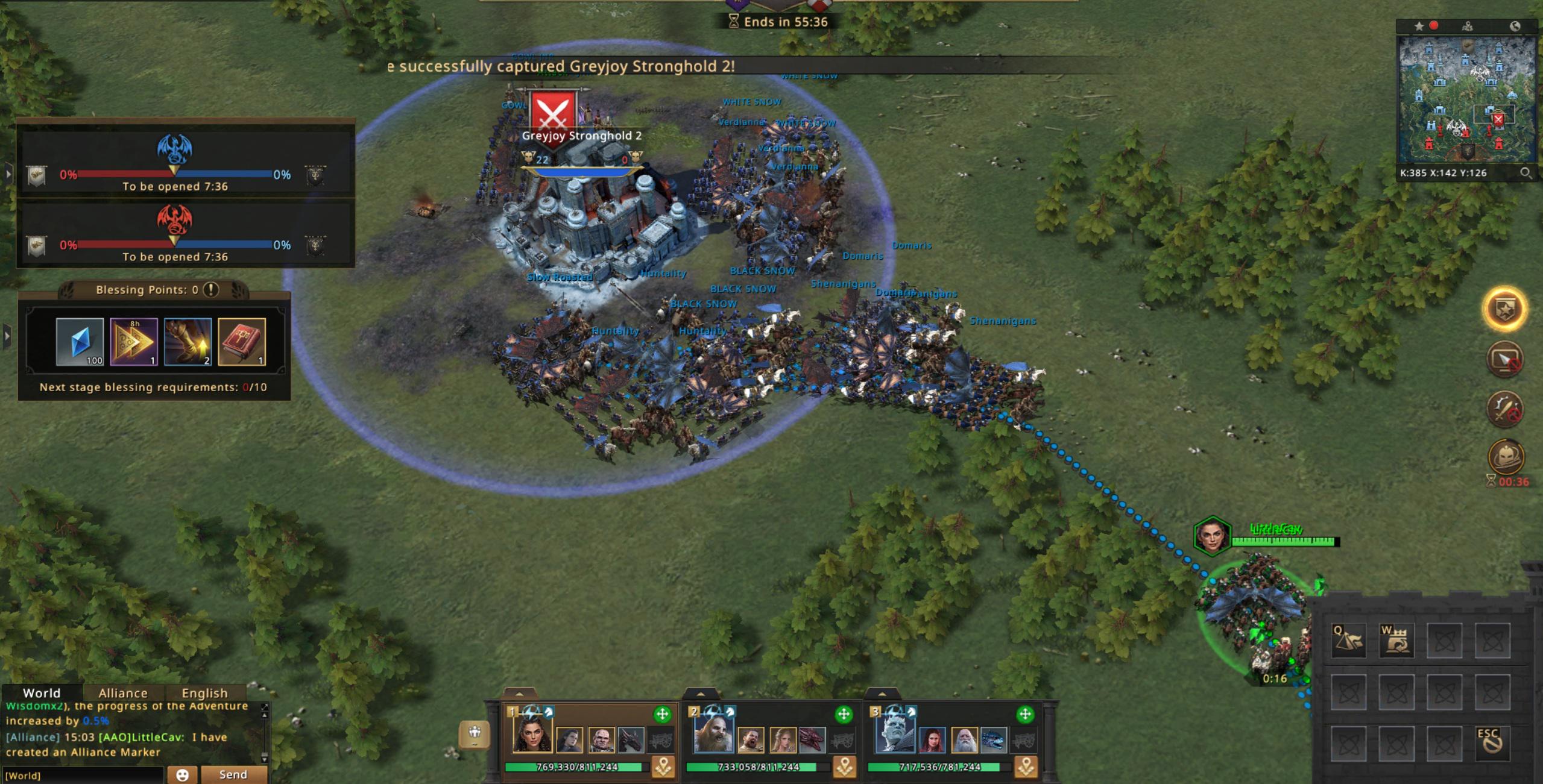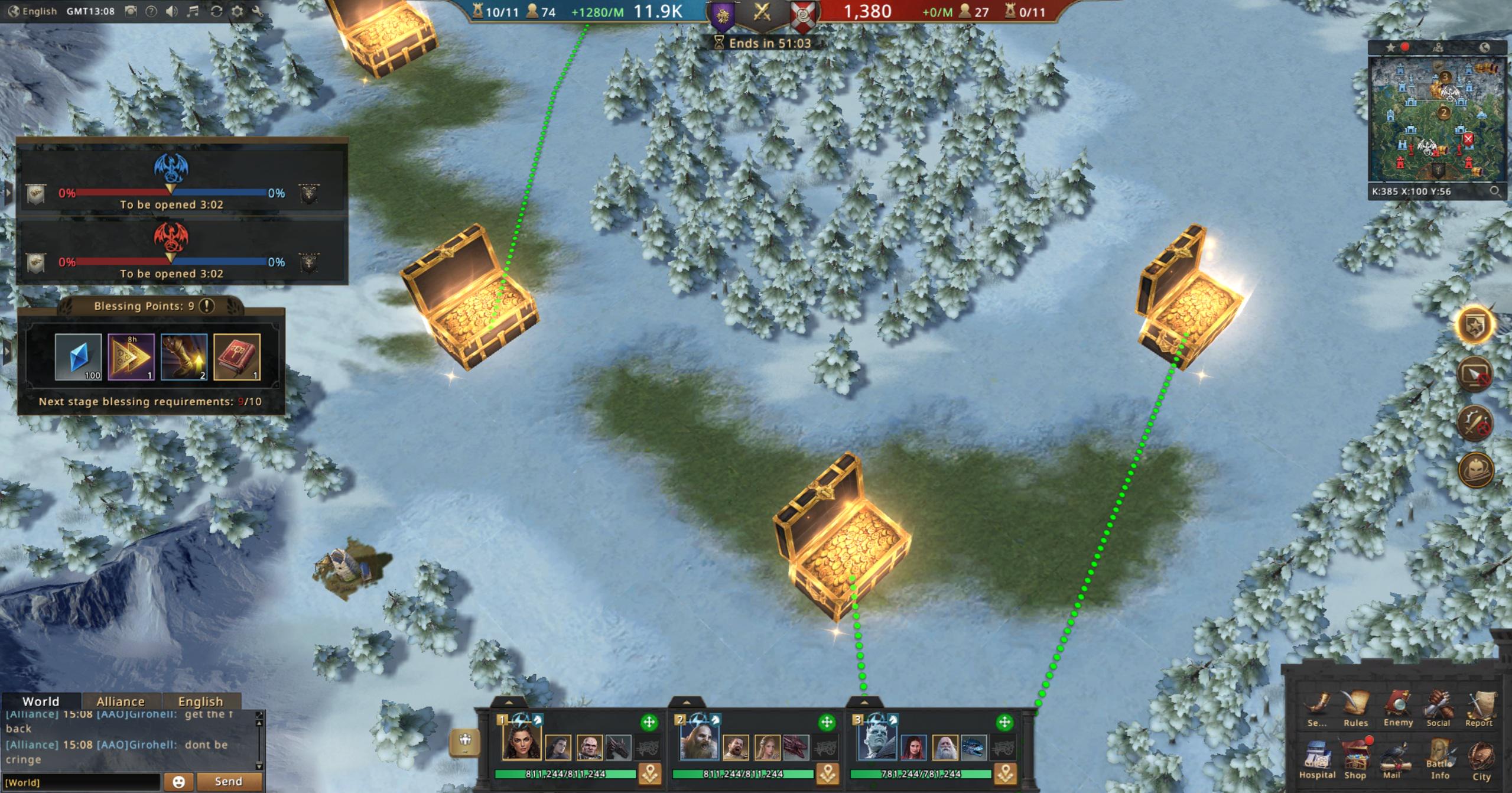If that’s the case, we might as well make good use of the match. The goal isn’t simply to win, it’s to hit bigger objectives: reach 80k points, collect 120 Blessing boxes for the alliance rewards, and then disband so the other side can still get something out of the game.