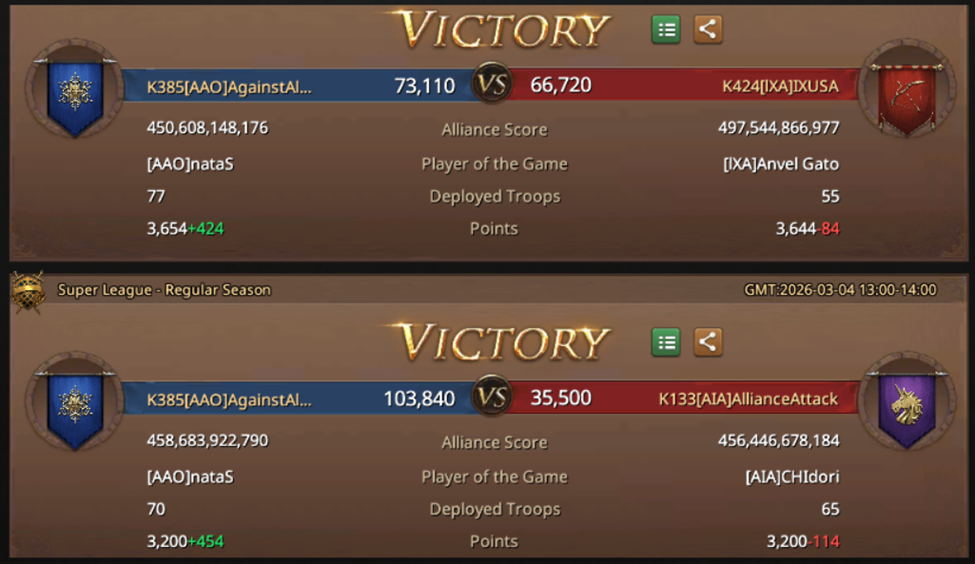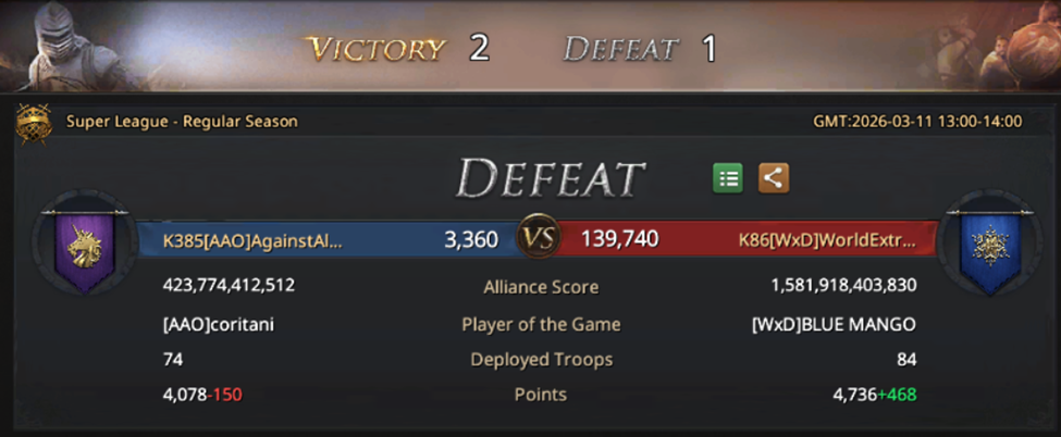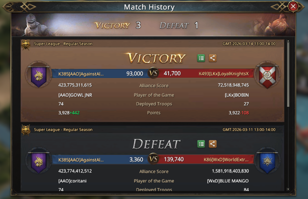 With four matches played in AAO and me only present for half of them, the alliance is now sitting at an impressive three wins out of four. The only loss came against WxD, which is hardly surprising. Considering AAO is playing in the Super League this season, that record feels even more impressive.