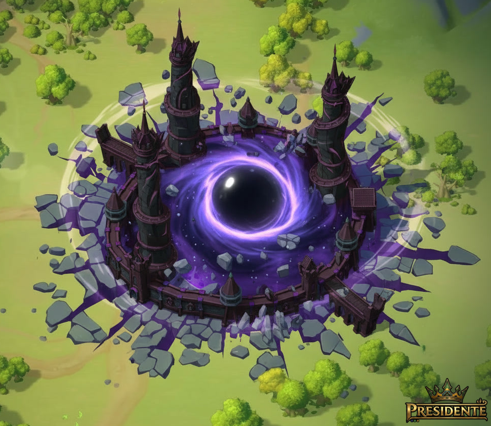 A fortress powered by a dark singularity that consumes everything around it, creating a mysterious, elegant, and extremely powerful presence — without destroying the map, but distorting reality itself.