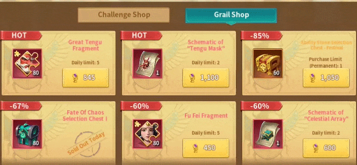 Every Chaos Immortal except Loki, Poseidon, Athena, and Wukong cost 750 grails. Their respective exclusive artifacts cost 1,000 grails. Medusa’s artifact cost slightly more at 1,100 grails. Loki, Poseidon, Athena, and Wukong are in the Fate of Chaos Selection Chest I, which costs only 250 grails but has a daily purchase limit of one. This is an extremely good chance for players to get those shards for cheap. Fu Fei Fragments are only 450 grails. Great Tengu Fragments cost 845 and his artifact cost 1,100 grails. The shop also features an Ability Stone chest that costs 1,050 grails and contains Siren’s Gaze, Smite, Storm Strike, and Implosion. Personally, I would skip that chest. Players can also purchase lesser rewards like Equipment Forging Stone Random Chests, Stellar Core Crystals, Holy and Shadow Selection Chests, their artifact chests, and Random Territory Decoration Fragment Chests. The grails carry over to the next event as well. This is a great chance for low-spenders and free-to-play members to get cheap Chaos Immortals.