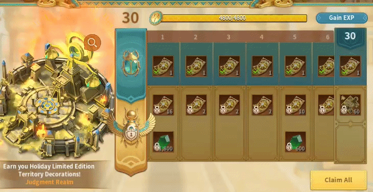 This event’s Battle Pass features the Judgment Realm skin, which increases the Physical and Magical Defense of Immortals by up to 15%. It also increases the production speed of all resources by up to 10%. Each stat starts at 5% and goes up as you develop the skin. It’s a solid skin, in my opinion, extremely similar to the Sun Chariot skin that gives Marching Speed instead of resource production speed. Sun Chariot is the better PvP version of the Judgment Realm. There are two tiers of rewards and 30 levels to complete. The free tier offers a total of 30 Tokens of Light. The premium tier costs $49.99 and gives an additional 120 tokens, 4,800 Gems, and 60 Judgment Realm Fragments. You need 60 fragments to craft one skin. Every development level requires a skin, so you would need 11 skins total.
