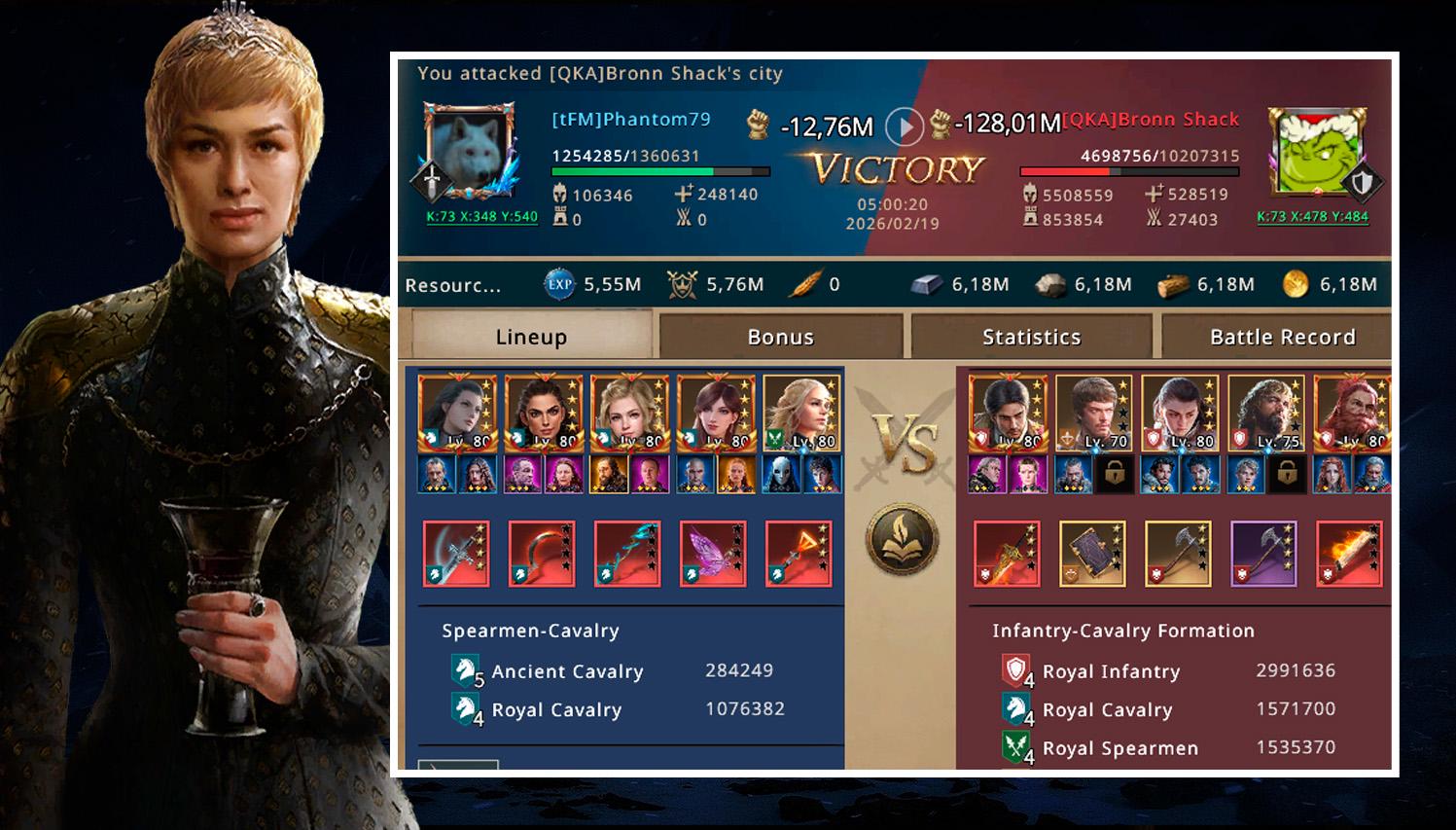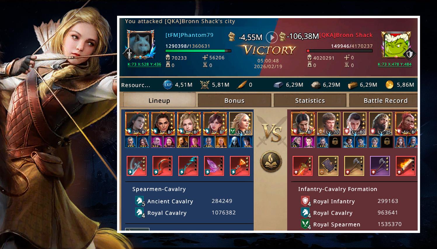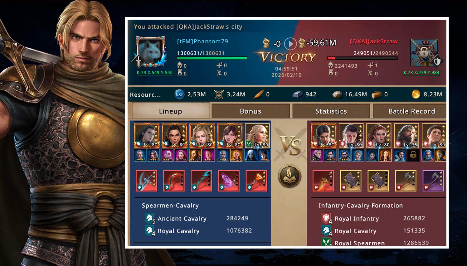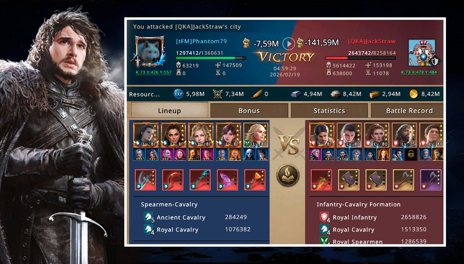 I attacked using female synergy and cavalry troops, giving me a clear advantage over JackStraw’s infantry troops. More than 1.3 million troops were sent, almost all of them being T4 units. By the end of the battle, JackStraw had lost more than 5.6 million men, while on my side, only 63 thousand T4 troops were lost.