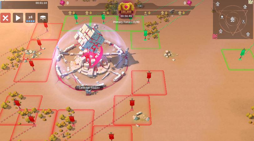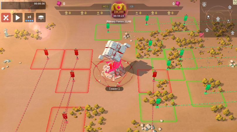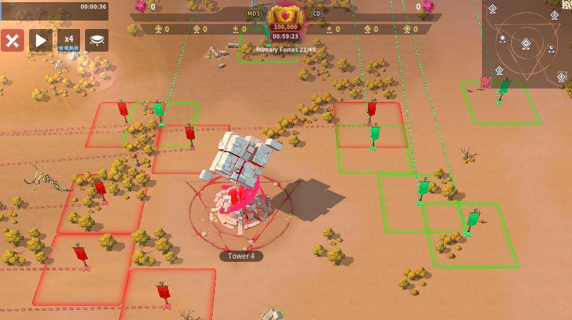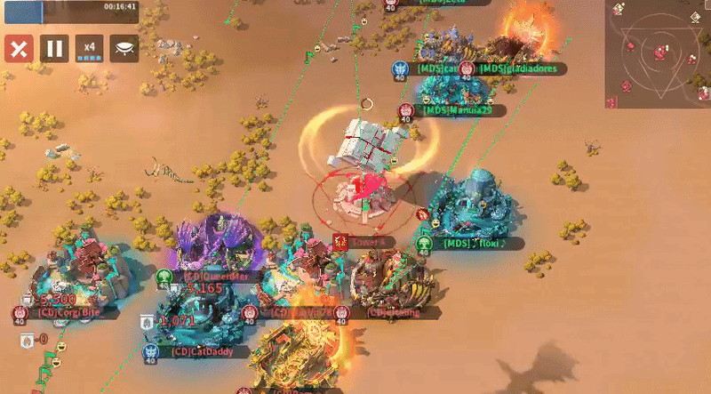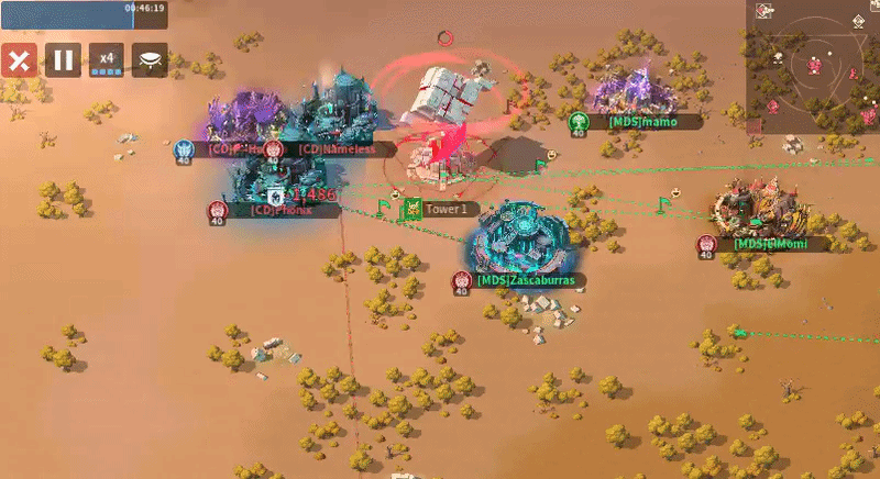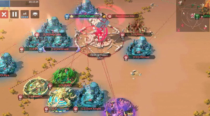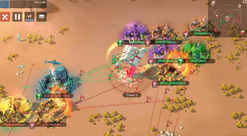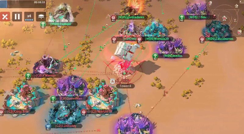 MDS sent six players to Tower 4 with one overlap, while CD also sent six, including one player attempting to block a relocation on the right side—an approach that is unlikely to succeed given MDS’s positional advantage. Only one MDS player effectively used their relocation to block two enemy placements, but overall both teams showed inefficient positioning, with too many players sitting too far from the tower instead of occupying key frontline spots. As the top-sided team, MDS should be leveraging their spawn advantage more aggressively, and if they can successfully block multiple CD relocations early, they should have the edge in controlling Tower 4.
