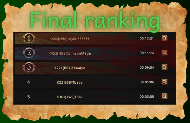 The final ranking saw, as widely expected, SkylinEEE in first place, while the fight for second was won by CrimsonMage thanks to a much larger number of allies supporting him until the last second, managing to surpass Tanalyn by just a few minutes, who had to settle for third place.