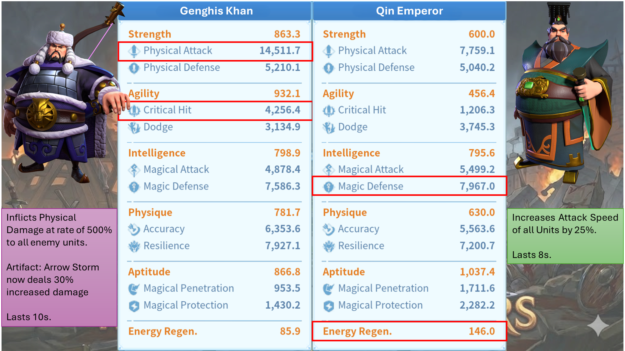 Genghis Khan is the definition of a "glass cannon" with a heavy emphasis on raw, physical destruction. Looking at the data, his Physical Attack sits at a staggering 14,511.7, nearly doubling that of Qin Emperor. This makes him one of the premier damage dealers in the game, especially when paired with his Critical Hit stat of 4,256.4.