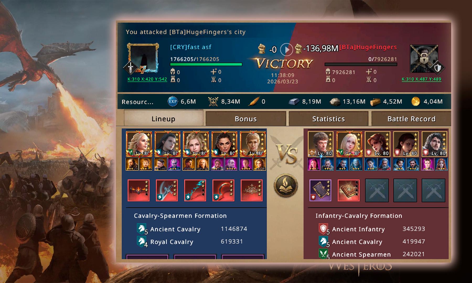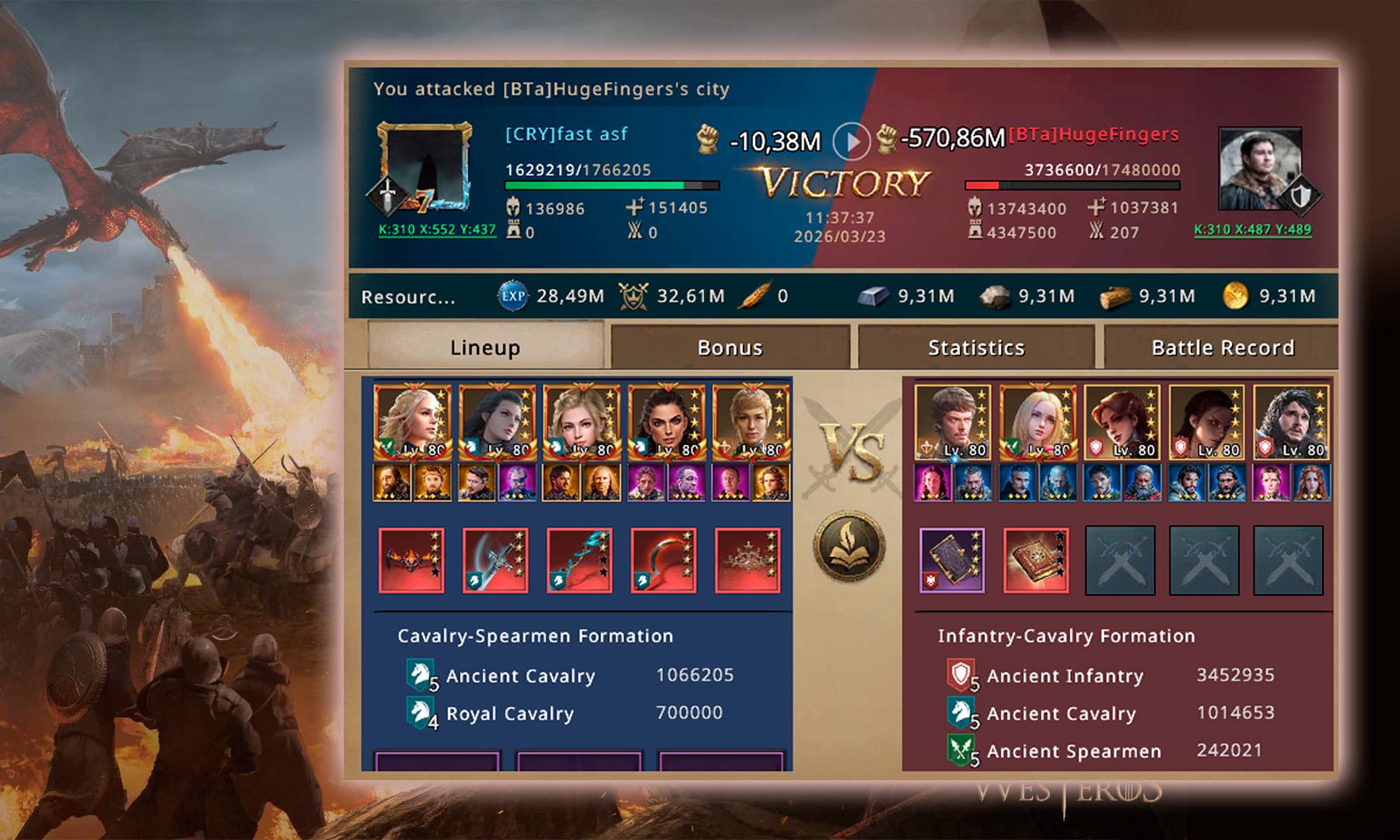 Floki was well prepared, and even knowing the level of risk he was taking, he could pull it off. His attack used Daenerys, Leila Mormont, Senelle, Salma, and Cersei as commanders, forming the powerful female synergy. The power gap was massive: Floki had the weapons of Daenerys, Senelle, and Cersei, making all the difference in that fight. On top of that, HugeFingers did not have any advisors who could provide significant support. Floki earned an impressive 32 million merit points in a single attack, dealing 570 million damage to HugeFingers and eliminating 13.7 million troops.