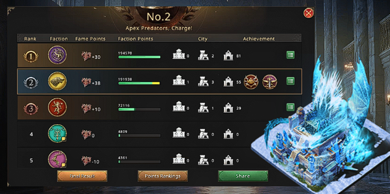 As time went on, the Targaryens began to take the initiative. They held the Towers and the catapults, and their points were growing faster than the Stark's. “We have to switch camps,” he suggested again, now with a sense of urgency. “Either the trading posts or countering them.” However, Dragonkiler now felt it was too late for changes and that they should focus on Glory, who had in the meantime taken YUROK.