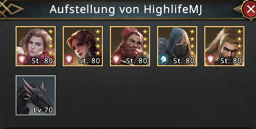 His formation consists of Sinara, Rhea, Barret, Kevin, Lareo, and his Level 70 Darkfyre (dragon). All five commanders have five red weapons and good stats.