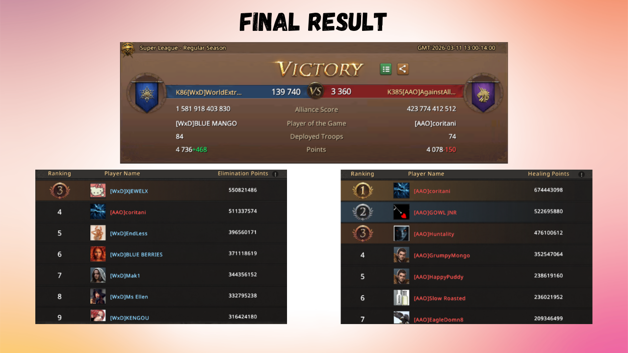 The resilience of AAO and the offensive strength of WxD staged a battle to the death in the stronghold, with neither alliance willing to give an inch. As the minutes passed and reinforcements arrived from the east side of the battlefield, where bzzb's group managed to prevail over their rivals thanks to AAO's strong concentration in the stronghold, the tide of battle turned. WxD's superiority became increasingly clear, allowing them to take definitive control of the position and repel their rivals!