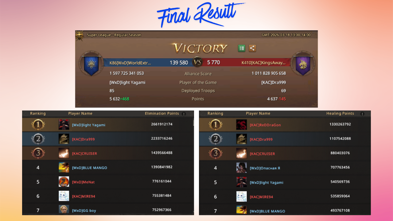 Vlodek and his teammates had no choice but to guard the exits of the KAC base and wait for the battle to end naturally. Despite their best efforts, 69 members against 85 on the battlefield was too big a difference in such an important alliance battle.