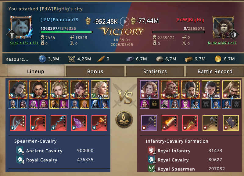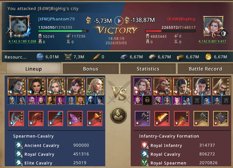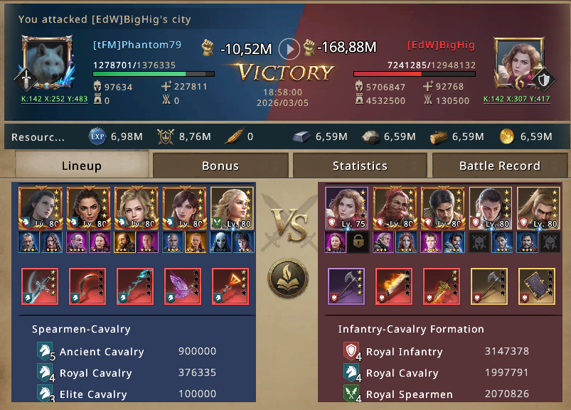 BigHig was a well-built infantry account. A formation with five infantry commanders, two red weapons, and more than nine million T4 troops stood defending the wall. But all that strength was not enough to withstand the attack of Phantomʼs powerful cavalry army and his flawless female synergy.