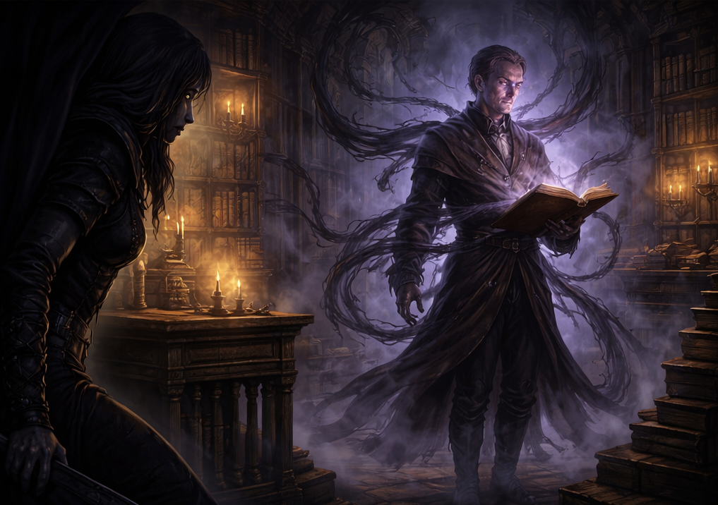 Encontró a su objetivo en la biblioteca, rodeado de pergaminos y mapas. El hombre confiaba en su seguridad, en sus muros y sus guardias, y no sospechaba que la verdadera amenaza ya lo observaba desde la penumbra.