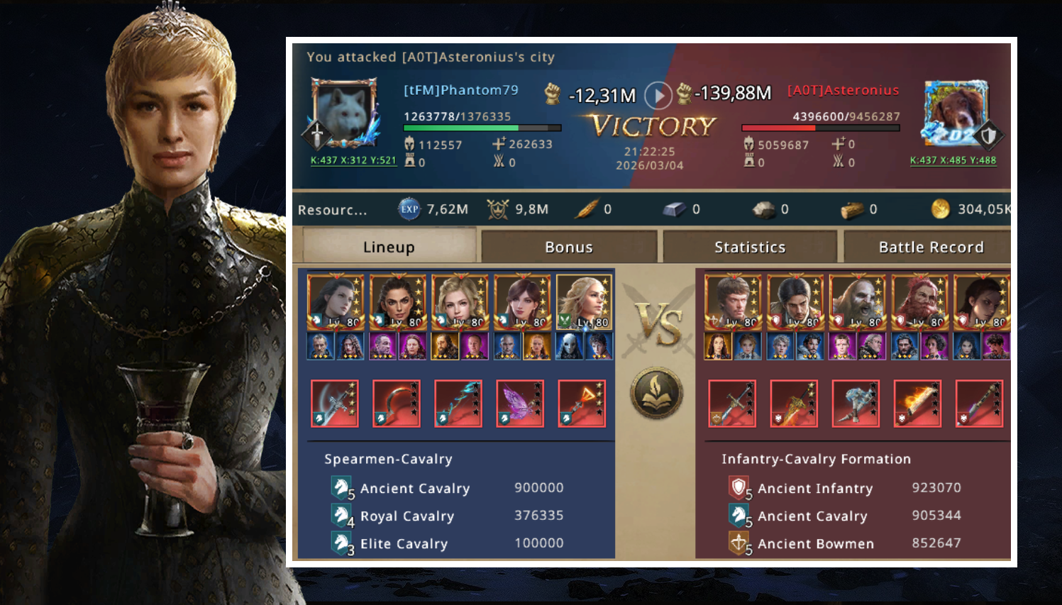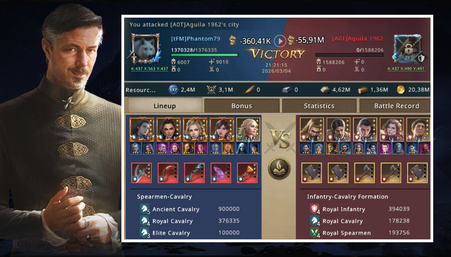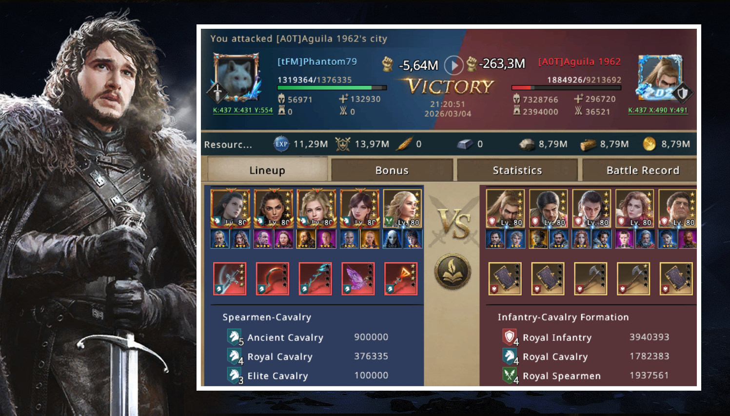 The second attack marked the definitive end of Aguila. His lord, troops, and resources were gone, and only ruins and fire remained in his castle. In total, I eliminated 8.8 million troops and earned 17.07 million merit points. An impressive number considering the low losses on my side.
