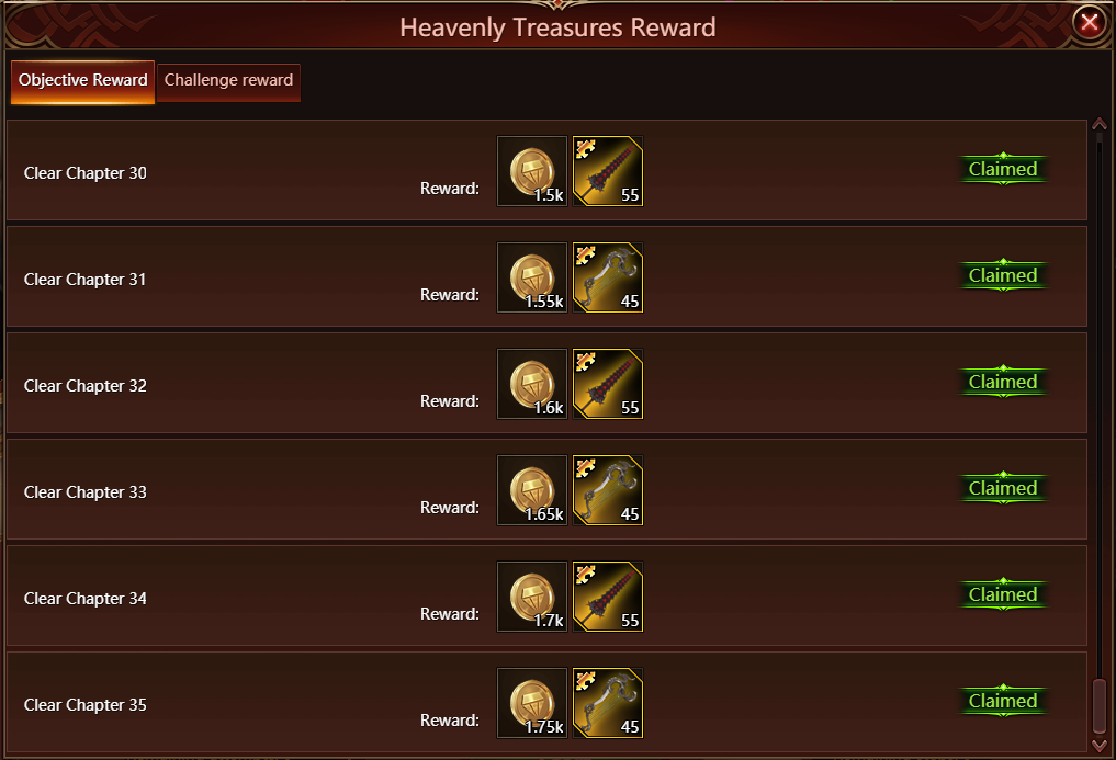 The Heavenly Treasures feature currently ends at Chapter 35 and its Objective Rewards remain at Artifact tier. I suggest extending the content to Chapter 50 or beyond, and updating the Objective Rewards to reflect the current state of the game so that completing higher chapters remains a worthwhile goal for advanced players.