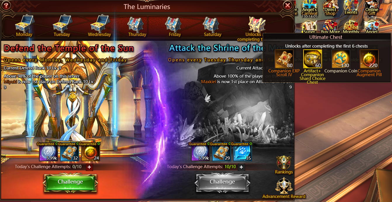 The Luminaries is a permanent in-game activity feature that offers daily chest rewards from Monday to Saturday, as well as guaranteed rewards tied to each challenge attempt. Both the daily chests and the guaranteed challenge attempt rewards currently contain Artifact tier items, which are no longer relevant to the current game progression. I suggest that the development team improve the rewards for both the Monday to Saturday daily chests and the challenge attempt guaranteed rewards to better reflect where most players are in terms of progression.