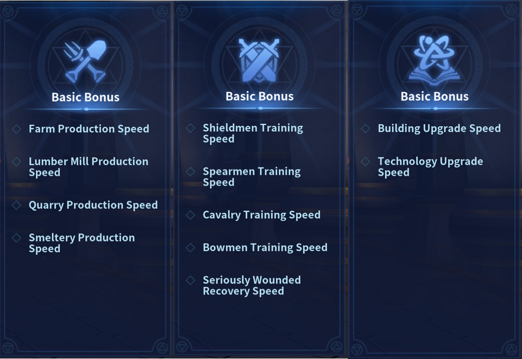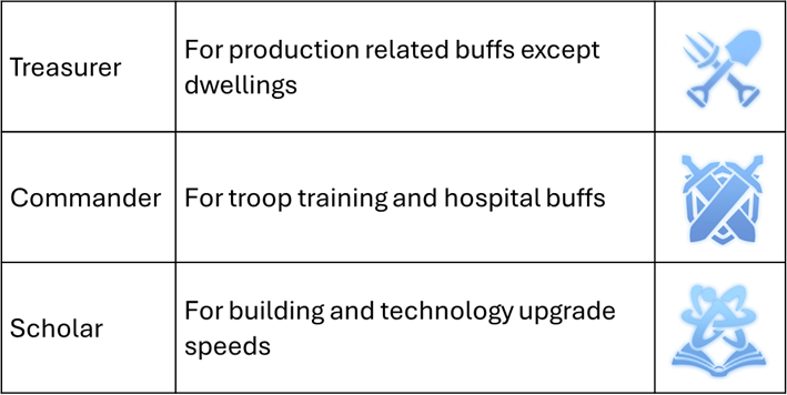 - The Commander: Essential for military might, providing buffs for troop training speeds and hospital recovery.