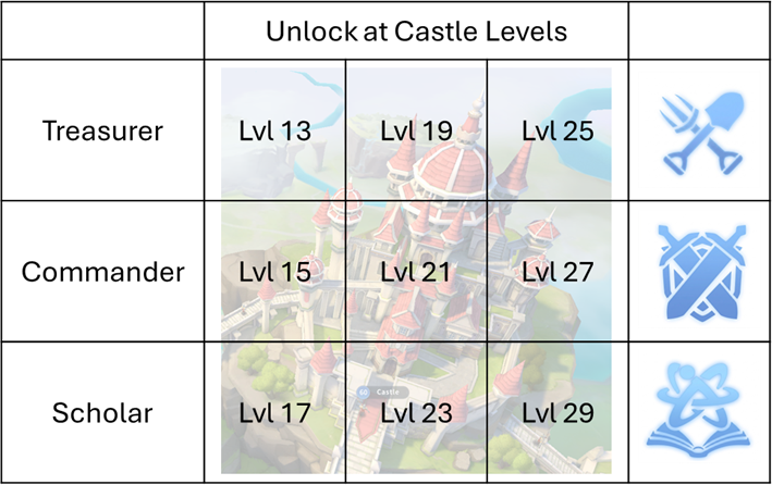 You won't have access to all of them at once. Much like your own rise to power, these slots unlock as your Castle reaches specific milestones. For instance, you get your first Treasurer at level 13, your first Commander at level 15, and your first Scholar at level 17. To maximize your potential, you’ll eventually want to fill all three slots for each category as you climb toward Castle level 29.