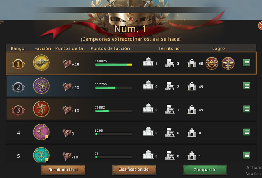 Our champions' Stark faction would take the overall victory with almost double the score, thanks to the point exchange building in one of the castles captured from the other factions.