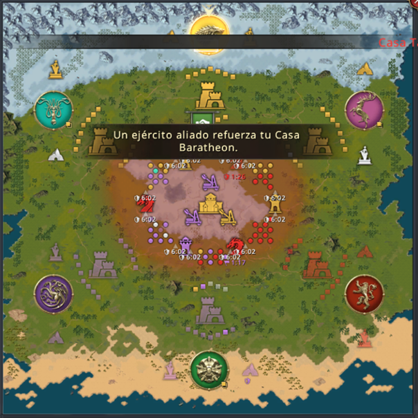 I didn't understand how, but the Stark faction, which they were fighting for, had already taken two castles, both the Tyrell and the Baratheon, even though the castle in question didn't have a primary allegiance. It was something I didn't fully grasp.