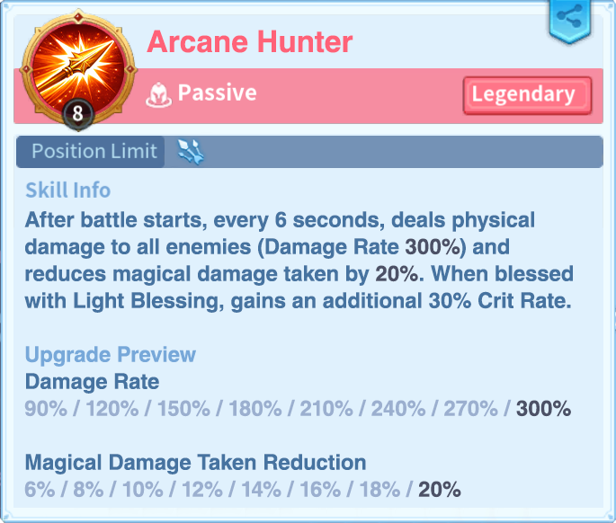 Arcane Hunter is a new red skill added in patch 2.9.4. At max level, it reduces magical damage taken by 20%, and every 6 seconds after battle starts it deals 300% physical damage to all enemies. On top of that, when the user is blessed with Light Blessing, the skill gains an extra 30% Crit Rate. It is also a Legendary Season skill, which means it is bought from the Wish Shop there and not from Conquest or lower seasons.