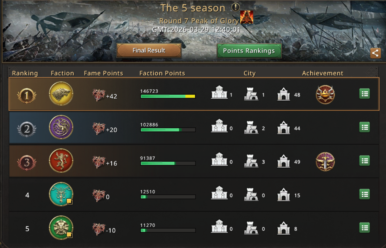 After a continuous battle that lasted almost 20 minutes with reinforcements dropping as low as 2 million troops and rallies being quickly made and sent back on attack, the House Stark finally managed to secure the City of Glory with under 10 minutes left to fight on the round and that basically secured them the win.