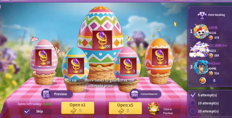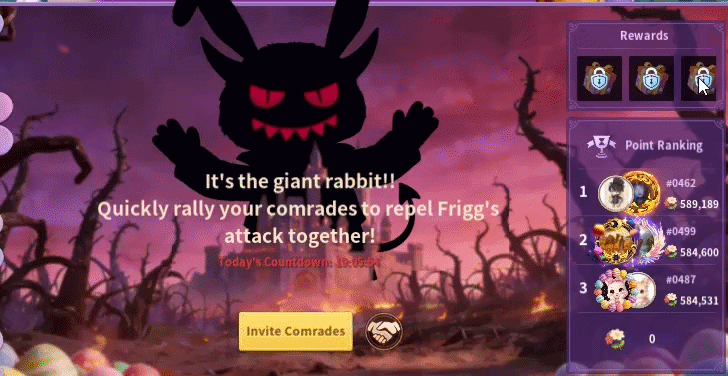 This event is available to players with Castle Level 20+, who must form 2-person teams to fight monster invasions together. Players use Eggs of Mischief to activate a roulette wheel that either damages the monster or grants material rewards, with higher multipliers increasing both cost and output. Teammates share progress in depleting the monster’s multi-bar health, earning “Repel Chests” as each bar is cleared. Monsters reset every 24 hours, requiring new teams daily, with unclaimed rewards sent via mail and every duo can defeat ten monsters daily. Players can also earn up to 50 extra Tokens of Light for defeating monsters. Rankings are split into daily team rankings based on combined points (resetting every 24 hours) and overall personal rankings based on cumulative points, with final rewards distributed at the end of the event. Players can earn Tokens of Light, Gems, Random Immortal Fragments, and various reward chests by being on the rankings. Players can also purchase Eggs of Mischief for $0.99, $1.99, $2.99, and $4.99.