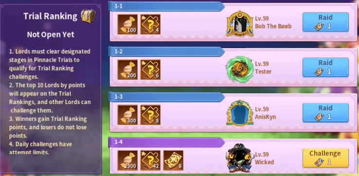Pinnacle Trials are extremely similar to the Glorious Challenges except that players only get 1 attempt a day and cannot purchase additional tickets. The rewards are significantly better, too. There are five levels, and it offers hundreds of Random Immortal Fragments and numerous Tokens of Light. After completing the levels, you can raid them to get additional rewards. The later levels are significantly more difficult since the enemies have legendary skills.