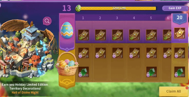 This event’s Battle Pass features the Judgment Realm skin, which increases Troops Attack up to 15%. It also increases the load of troops by up to 10%. Each stat starts at 5% and goes up as you develop the skin. It’s a skin worth skipping as there are better PvP skins available, like the Sun Chariot skin. There are two tiers of rewards and 30 levels to complete. The free tier offers a total of 30 Tokens of Light. The premium tier costs $49.99 and gives an additional 120 tokens, 6,000 Gems, and 60 Hall of Divine Might Fragments. You need 60 fragments to craft one skin. Every development level requires a skin, so you would need 11 skins total. The battle pass is worth getting for the Tokens of Light.