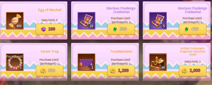 Players can trade in their Original Festival Coins for prizes. Everyone should aim to get all the important items. Since players can purchase one set of five Tokens of Light a day, you can get up to 50 Tokens of Light throughout the entire event. Players should also aim to get the Sweet Trap avatar frame and the Troublemakerchatbox as those are limited-time exclusives. Players should try to get the 100 Stardust for 1,000 coins per day. The tokens and Stardust would cost a total of 3,000 coins a day. Given that you get five free challenge attempts per day and you can earn 170 coins per attempt for the first three days, it would take 12 additional attempts. After the hard mode becomes available, the required attempts will decrease.You can purchase 100 Glorious Challenge tickets for 8,000 Gems. If you raid the last level of the Hard Mode, you can get 28,000 coins with 100 challenges.