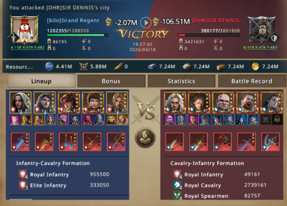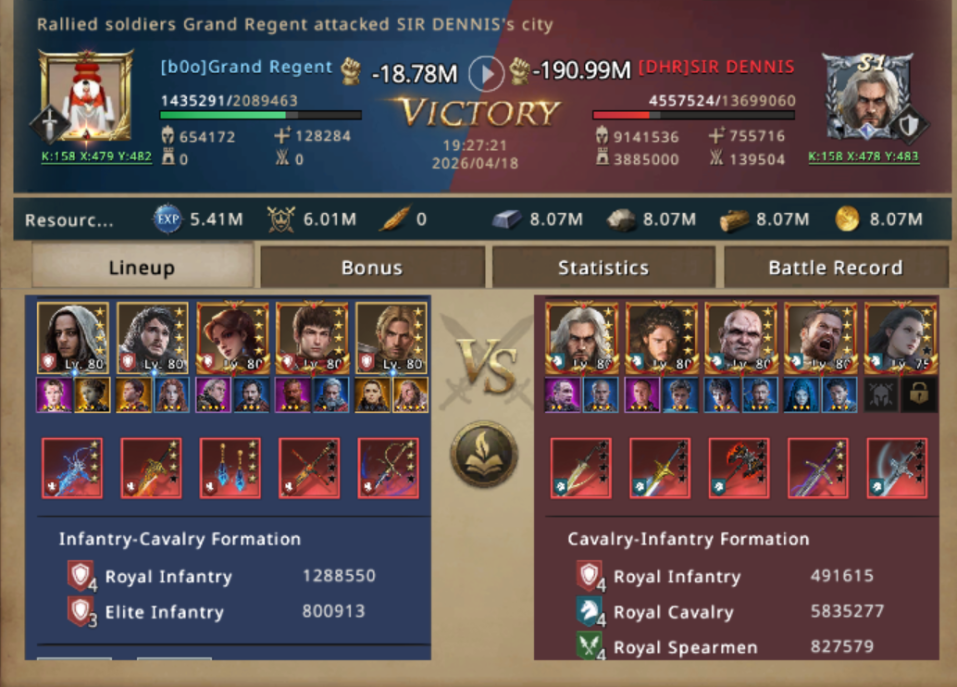 She didn’t stop to admire the score. Her eyes were already moving. Nearby sat SIR DENNIS, another DHR member. This one was cavalry-heavy, lighter on its feet but lacking depth. Too much Camie thought for a solo attack to handle, choosing to initiate a rally and utilise their extra cities for reinforcement, their first hit confirmed it: the defense held for a heartbeat.