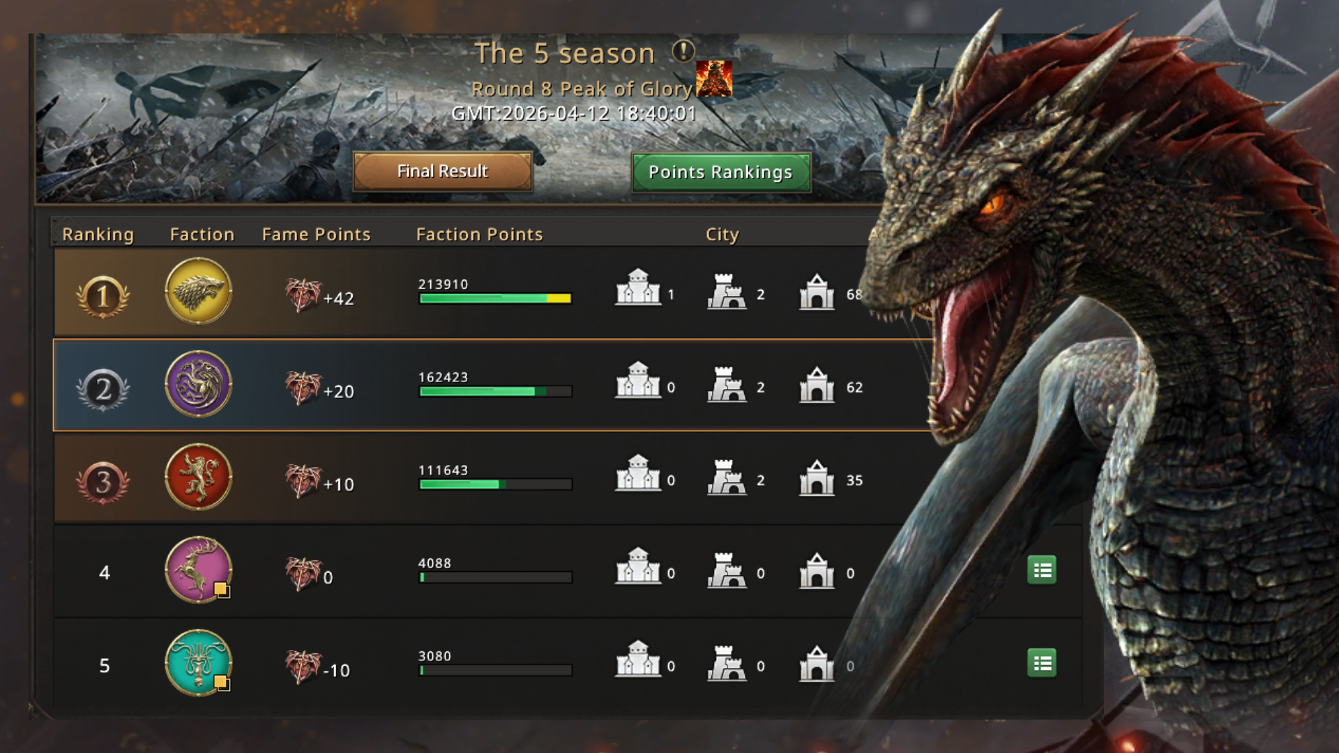 The battle for Glory City had begun. At first glance, the Starks seemed to be the stronger side, but they expected the Lannisters to break through the defenses, creating constant turnover in the main building. Stunnz, wanting to help, launched a rally. THE WICH, knowing the outcome in advance, sent his troops anyway—it was worth a try. If they managed to drive out several enemies, perhaps the Lannisters would have a chance to take the building and thus reset the timer, but the report showed the opposite, and the Lannisters’ lack of organization made them change their minds quickly. Their plan was now to secure second place. To do so, he asked his teammates who were focused on the attack to start spamming the enemy altars in order to capture some and earn points, creating enough disruption to distract the enemy so they could take the most important ones. The Lannisters, who were currently in third place, launched an assault on the Targaryens’ Altars of the Maiden.