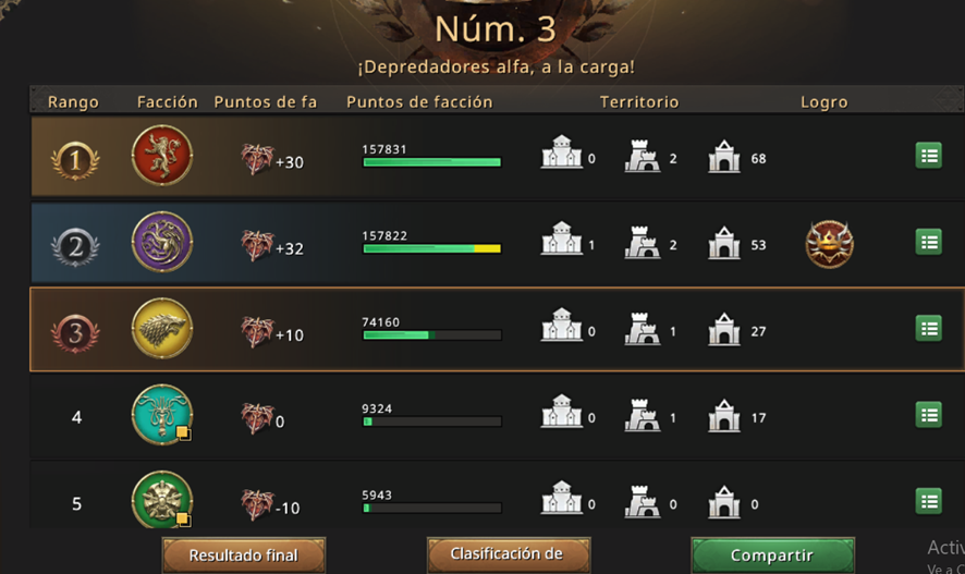 The Stark Faction, to which our Lord belonged, suffered a disastrous defeat for the first time this season, finishing in third place. While it's true they didn't lose points, it's practically a loss against the other Lords, or rather, against everyone.