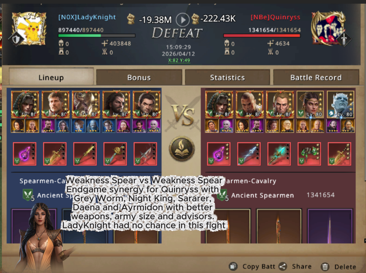 Westeros is quickly heading towards Easter; the springs is fully set in and it's time for the preparations to begin.But before that the warriors in Westeros have to sharpen their blades train their troops in preparation for the upcoming round of Arena of Honor. Being now past its mid-season the rankings are starting to settle in and the teams on top are slowly but surely detaching from others. After having 7 great rounds with the team, this time mostly due to Easter Celebrations, LadyKnight won't be able to play with the team and knowing she can't afford to skip a round, she decided to go back to the mercenary camp and try a round of solo queue, despite being aware that at such high fame points, the solo queue matches are very punishing and she'll most likely face very strong enemies. Once she arrived there, she signed the registration papers and then waited together with her commanders for the matchmaking to be done by the Old Gods.