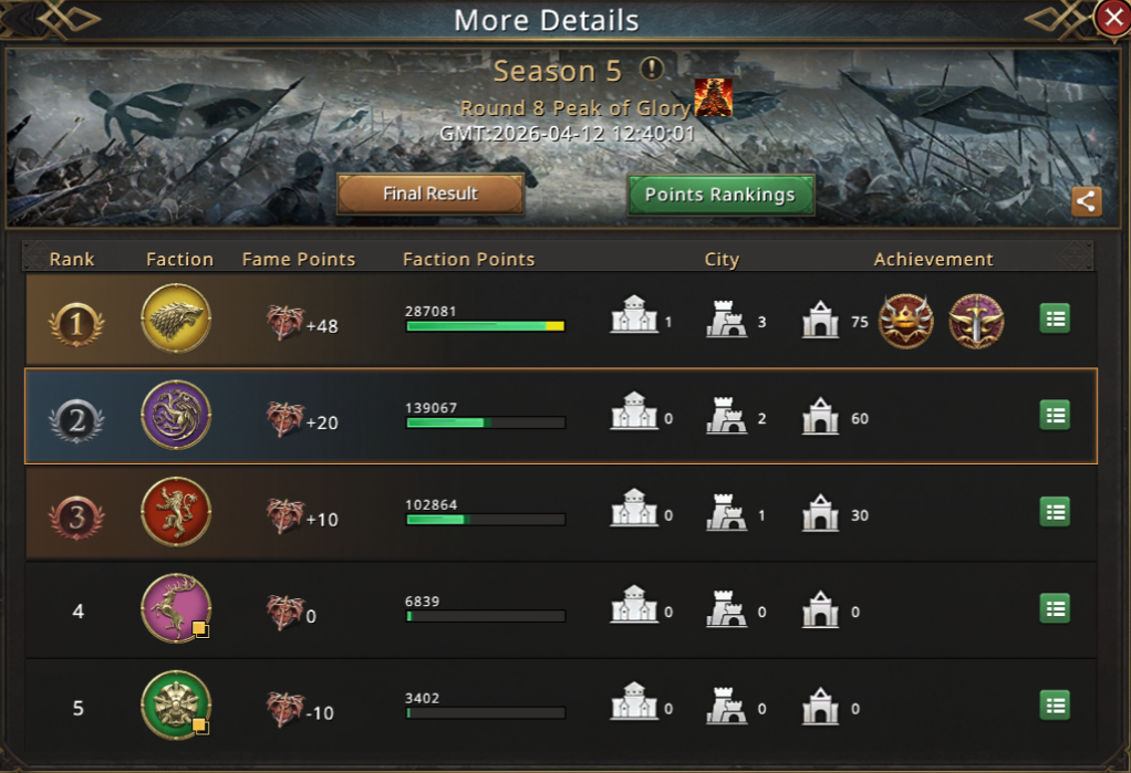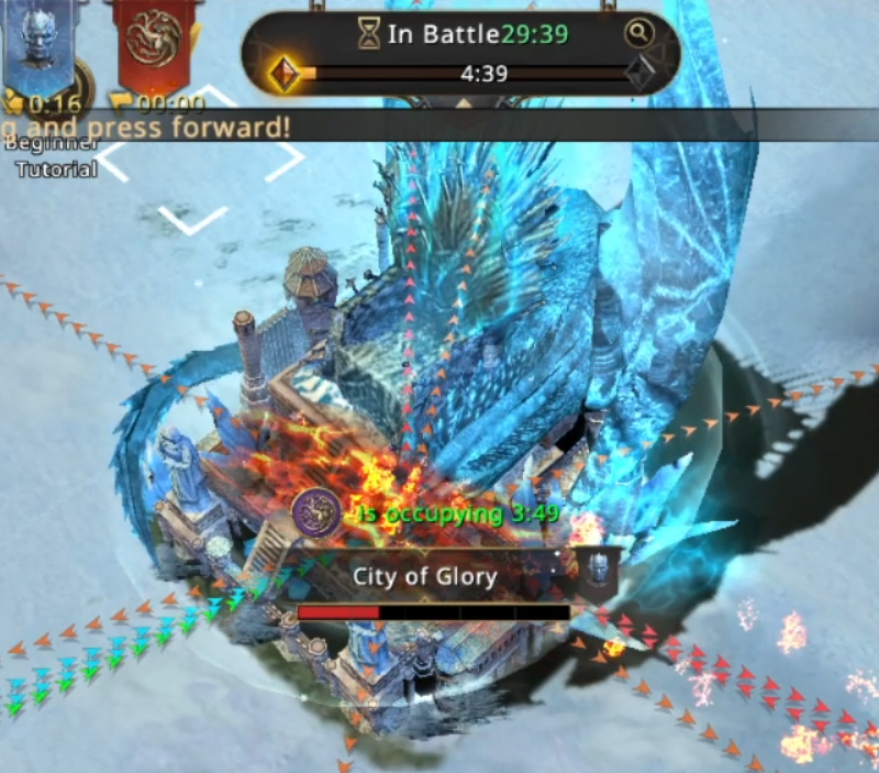 While they say it's not good to put all your eggs in one basket, the Targaryen's last chance to win was holding the City of Glory so they decided to go for it right at the start and then see if they can deal with the Starks mainly. As soon as it opened, the House Lannister warriors tried to take the lead on it with a quick solo from The Plague and then everyone reinforced him with their finest infantry but even like that his infantry weren't a match for Quinryss's better trained spears and after a bit over a minute of occupation the city swapped hands. With Starks's holding the city a temporary alliance never seen in Westeros was formed between Targaryen's and Lannister's and each sent their strongest warriors to retake the city. Unfortunately, despite doing a lot of rallies and sacrificing a lot of troops, nobody managed to kick Quinryss of from the City of Glory and the Starks managed to secure their win.