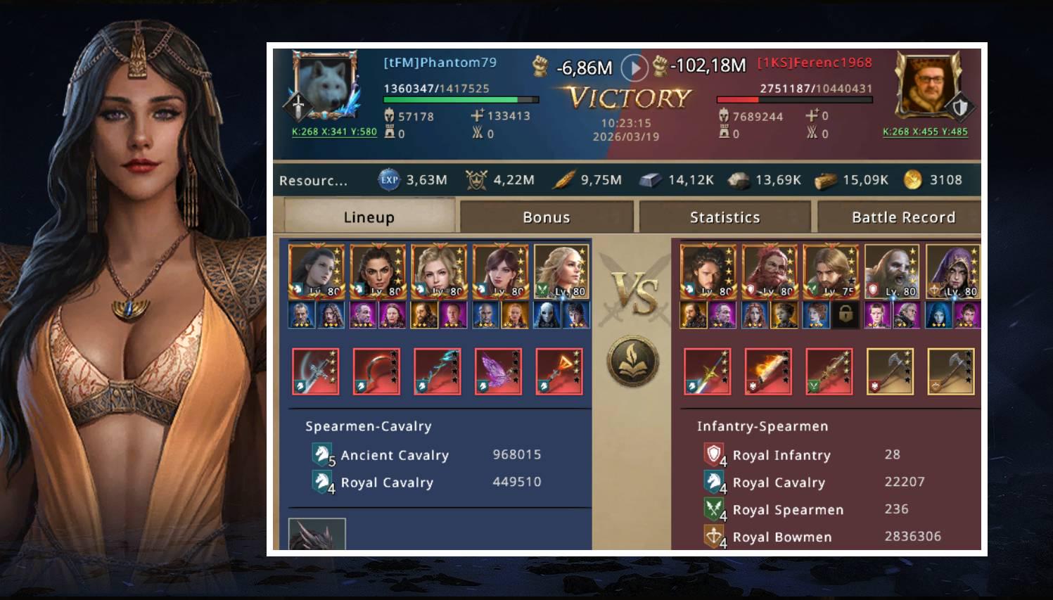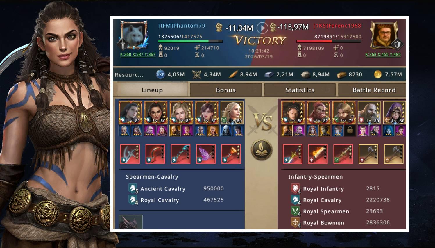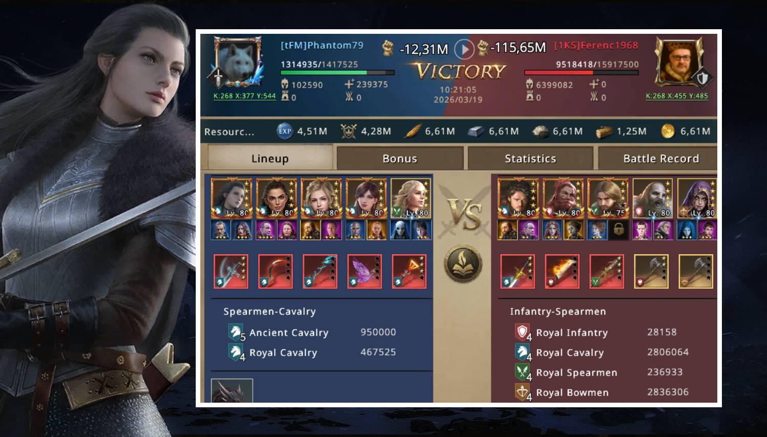 I attacked my target with a powerful female synergy and more than one million four hundred thousand soldiers. On the other side, Ferenc defended himself with an imposing wall of nearly 16 million troops, but there was a fatal flaw that left him extremely vulnerable: everything was mixed… infantry, cavalry, bows, spearmen, no defined formation, no synergy, no real defensive strategy.