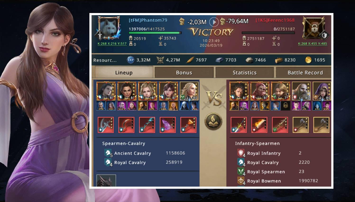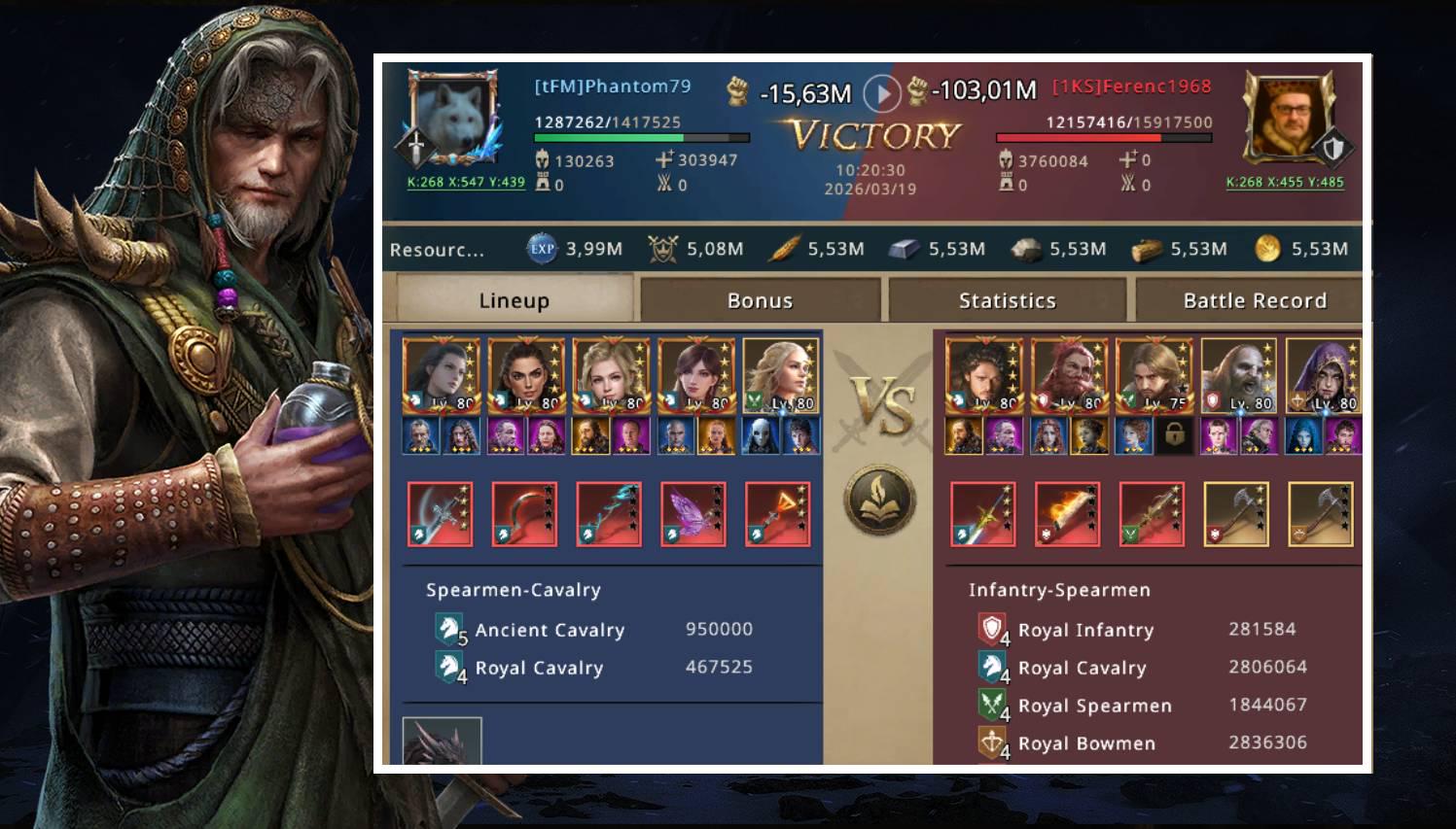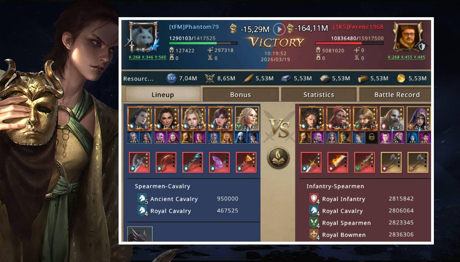 I attacked my target with a powerful female synergy and more than one million four hundred thousand soldiers. On the other side, Ferenc defended himself with an imposing wall of nearly 16 million troops, but there was a fatal flaw that left him extremely vulnerable: everything was mixed… infantry, cavalry, bows, spearmen, no defined formation, no synergy, no real defensive strategy.
