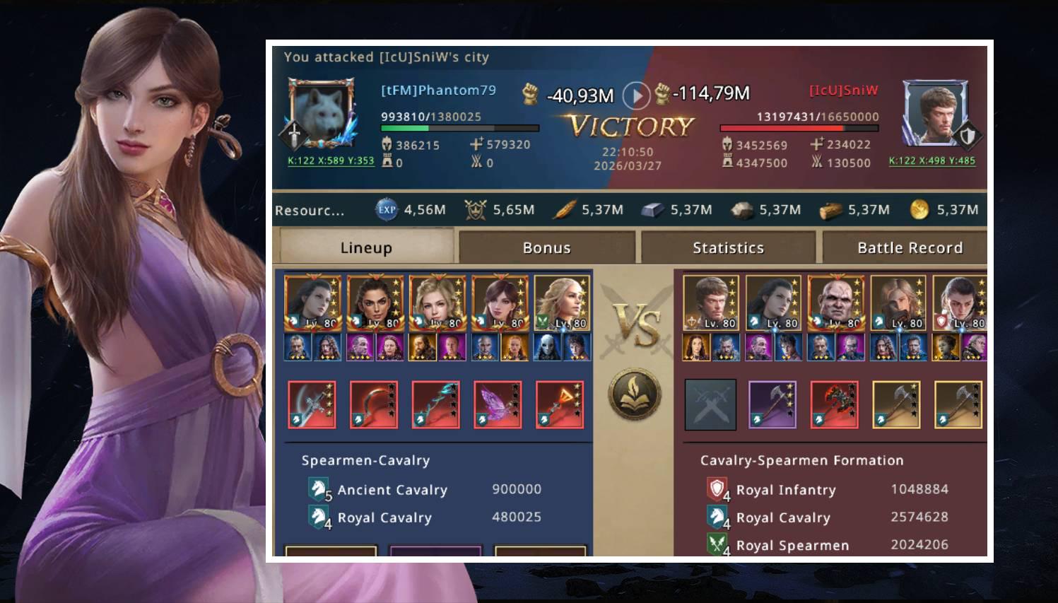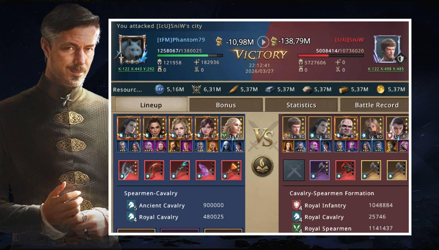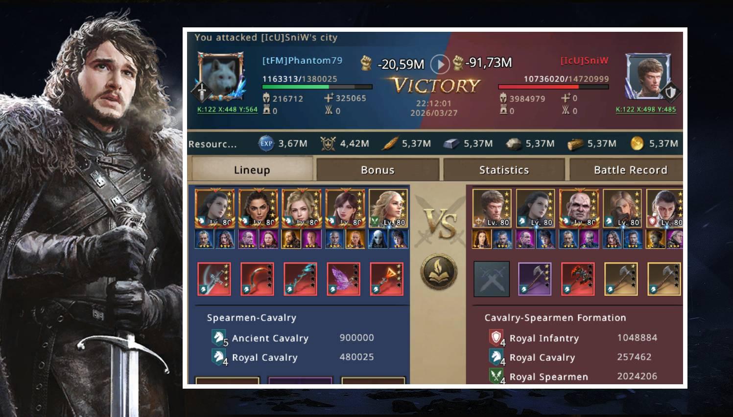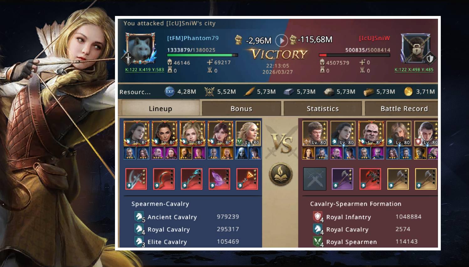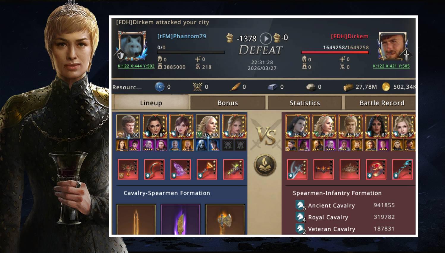 I stayed quiet for a moment, trying to understand what had just happened. When I opened the battle report, I was shocked. Nearly one million of my men had been brutally killed or wounded. The problem was much bigger than I had imagined. I kept wondering how SniW, without synergy, base attack, or battle gear, had managed to deal so much damage to my army. The answer came shortly after: even not being in a battle setup, SniW had more than 1300% cavalry attack, which was a huge problem considering he had a wall with more than 16 million troops.