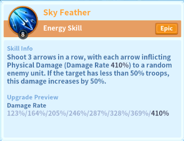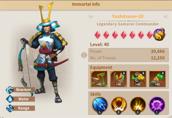 Yoshitsune (Yoshi) is a staple immortal in the water team, he is easily obtainable from advanced summons, and has good synergy with the water team, specially Herald. Yoshi's ability is Sky Feather, it shoots 3 arrows in a row, and each will cause up to 410% damage to enemy units at random. If the target hit by an arrow has less than 50% troops, the damage will be increased by 50%. This will make Yoshi's ability work especially well with Herald's ability Glacier Incursion that will cause the opponent to have their defence reduced by up to 35%.