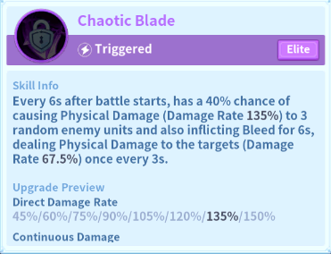 The other option for Yoshi is Chaotic Blade, which will also work in synergy with Anger or Duel Master. Chaotic Blade has a 40% chance of causing up to 150% damage to 3 random enemy units and bleed, which will cause about 75% damage every 3 seconds for 6 seconds.