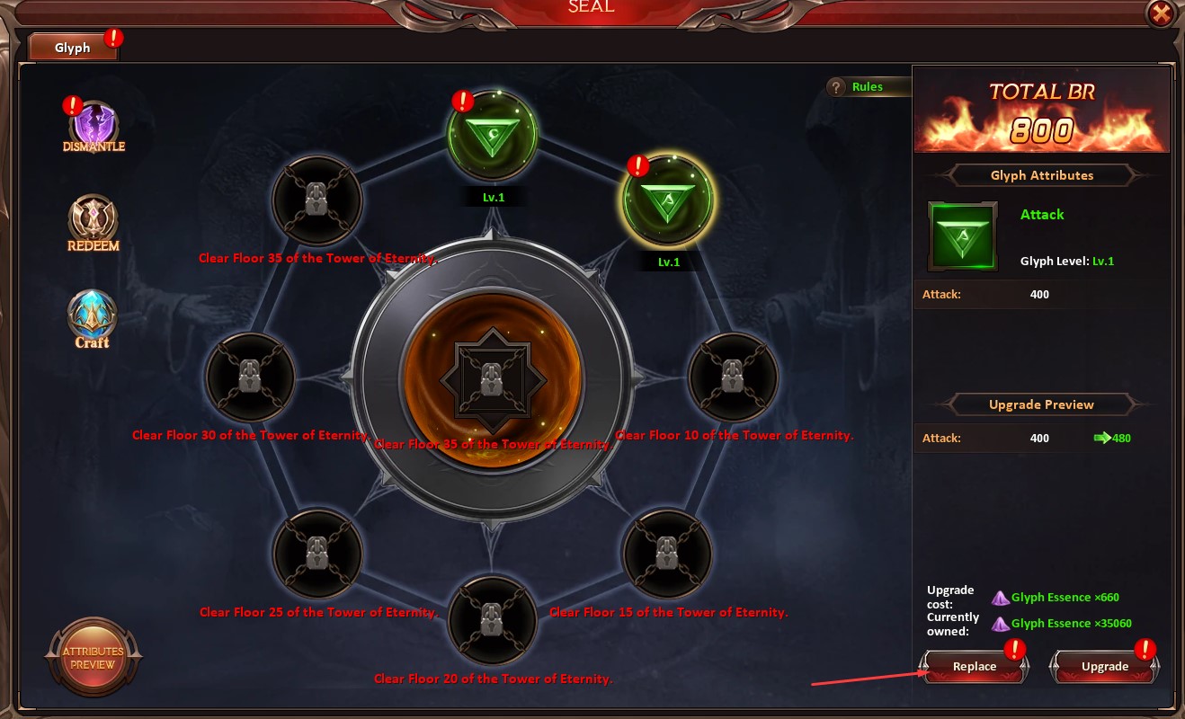 You will also see a ! on a glyph that can be replaced by a better quality one that's in your inventory. Highlight the glyph and click on the red REPLACE button at the bottom right (indicated by the red arrow in the photo below). This opens up your glyph inventory.