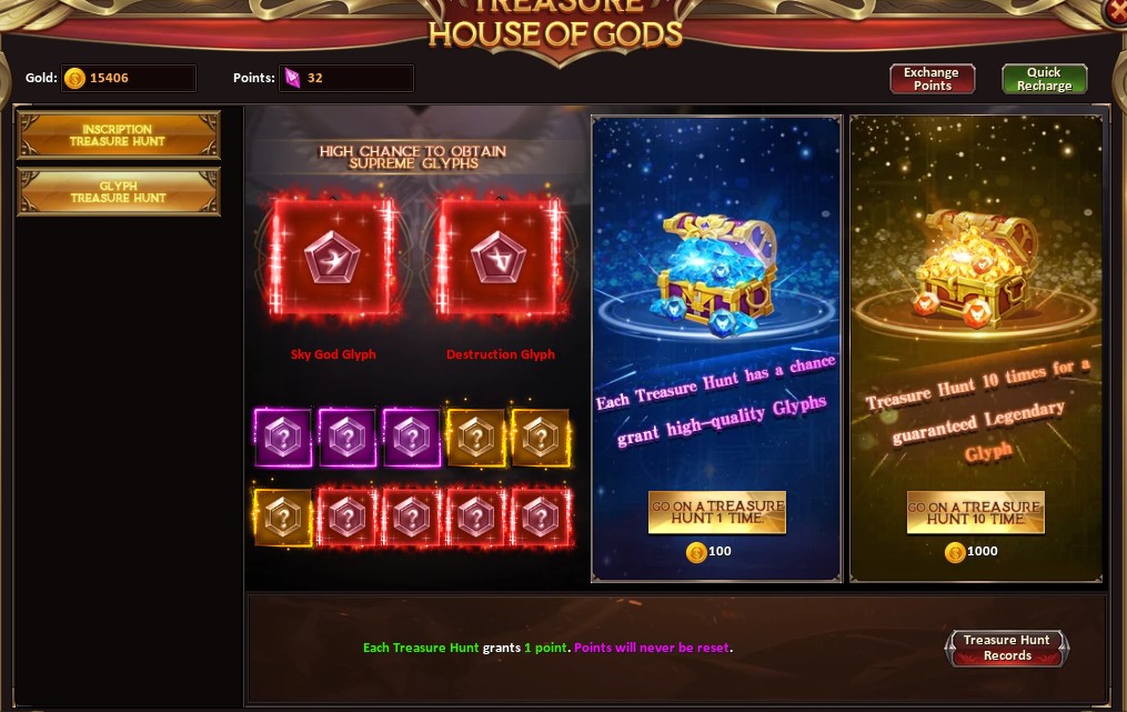 You can spend 100 gold to go on a treasure hunt one time that has a chance of receiving a high quality glyph, or you can spend 1000 gold to hunt 10 times and get a guaranteed legendary glyph.