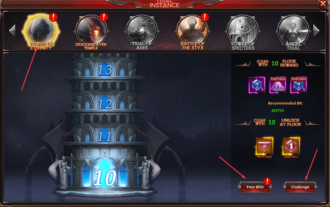 Here, you can blitz the floors already completed, or challenge a new floor. You may challenge floors as often as you want - there are no limited attempts. Every 5 floors, you will unlock a new type of glyph that could drop.
