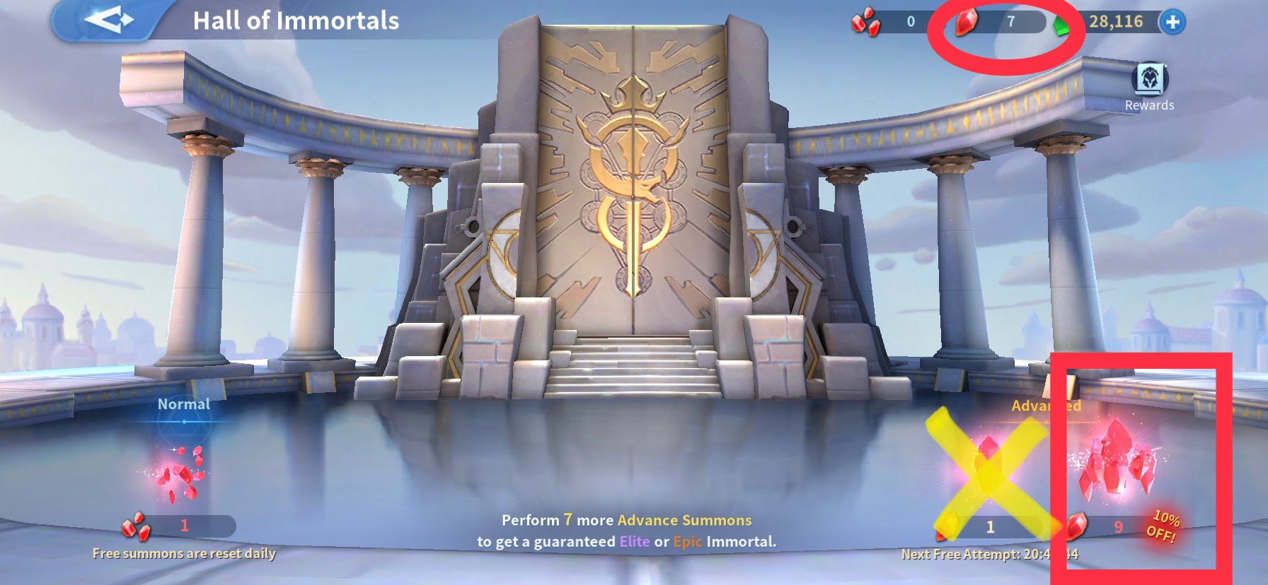 When you complete the Daily Tasks make sure you only use the Free stones the game provides every reset. Reason is, you want to make sure you collect up to 9 philosopher’s stones to perform an Advance Summon because it will give you an additional FREE philosopher’s stone and BETTER chances at obtaining EPIC immortals or EPIC immortal fragments.