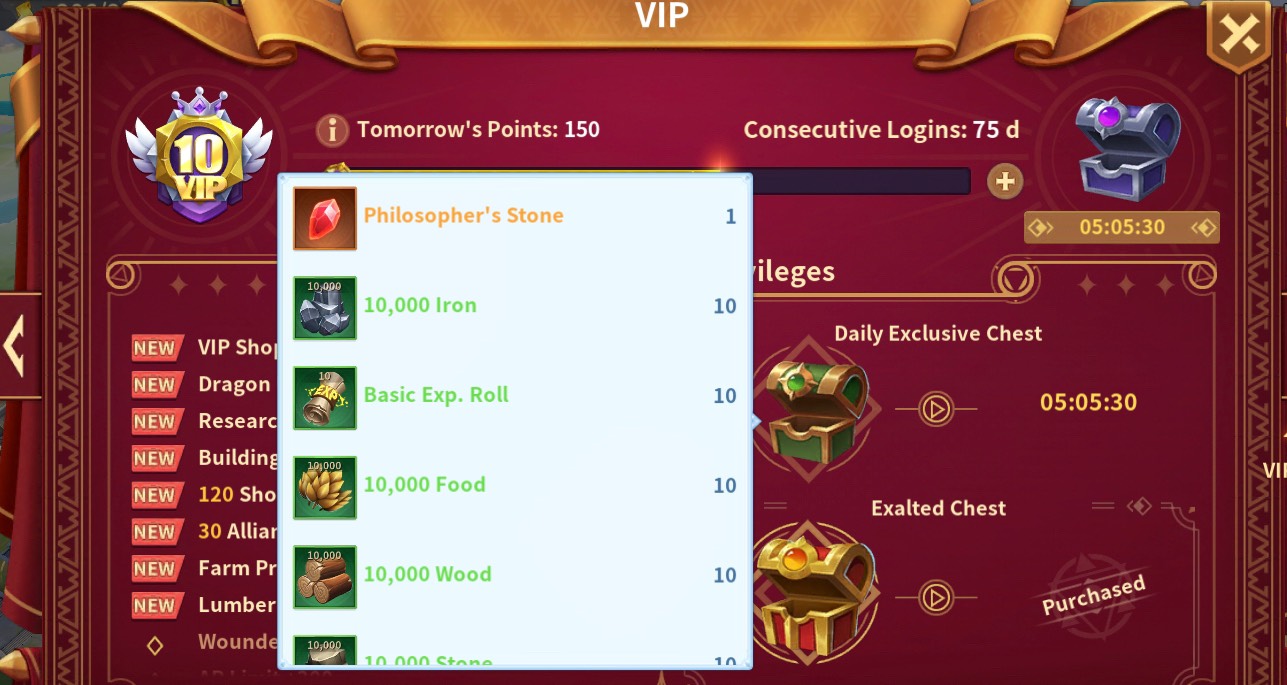 For the light/moderate spenders once you reach VIP 10, you get an additional FREE philosopher’s stone daily from the Daily Exclusive Chest.