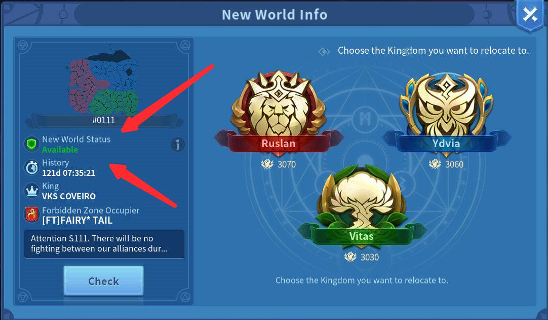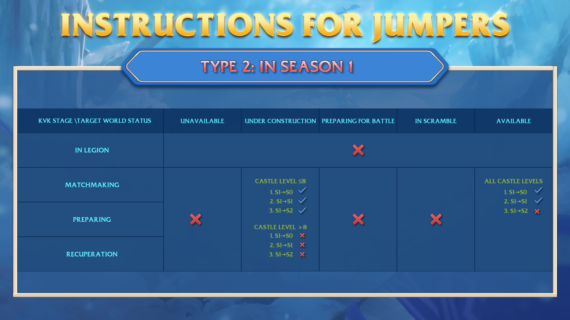 2) KVK Stage in Matchmaking, castle level ≤ 8 can migrate when the target is under construction, all castle levels can migrate during world status Available. (All Castle Level can migrate to the equal season/ season2)