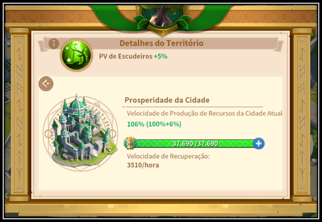 Prosperidade são os pontos de saúde do seu território, que tem impacto na quantidade de recursos que você irá gerar, se sua prosperidade estiver cheia, sua velocidade de produção de recursos será de 100%, quando zerado, esse número cai para zero. Você também recupera esse recurso a cada hora e pode obter uma decoração especial do evento Trono do Supremo e Reino vs Reino. Você também pode verificar sua prosperidade em dois lugares, um é apenas clicando em seu território no mapa do mundo, e o outro é clicando na estátua de sua facção dentro de seu território.
