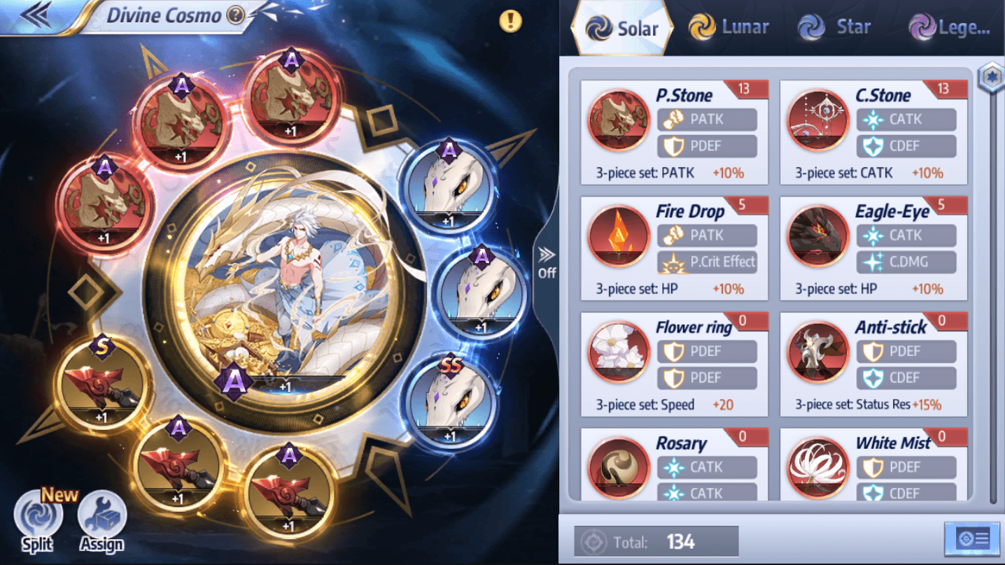 There are three types of basic Cosmo slots and one special Cosmo slot. Solar Cosmo fits in the red slots; Lunar in the yellow slots; Star in the blue slots, and Legendary in the special slot. Socketing three Cosmo of the same type activates its set bonus attributes. The number "+1" beneath a Cosmo represents its level, which can be increased via Intensifying it. The “A” at the top represents its quality. This cannot be changed after obtaining it, and the highest quality is SS. Every Saint has to be equipped with its own Cosmo. This can be done via Lobby - Growth - Your Saint - Cosmo (Cosmo unlocks at account level 21).