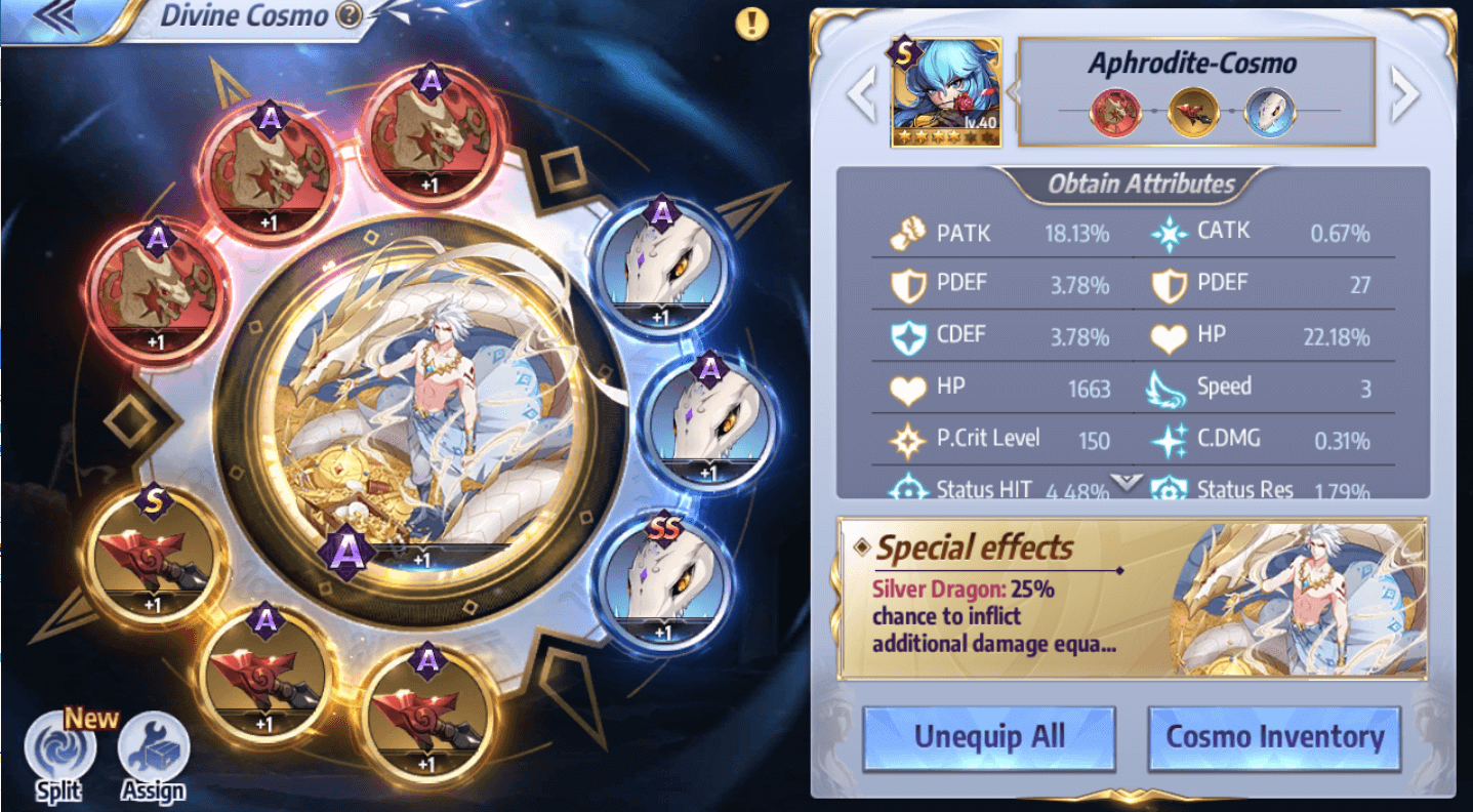 Legendary Cosmo come with different special effects which are active in battle. These effects are generally classified into Offense, Defense and Support (healing, crowd control, etc.). Special Cosmo are best equipped depending on your Saint’s skills, your lineup and their role in it. Damage-type Saints should generally be equipped with attack-type ones, whereas crowd control and healer-type Saints usually fare better with support Cosmo. For example, the special effect of Silver Dragon pairs very well with Shaka’s combo attacks.